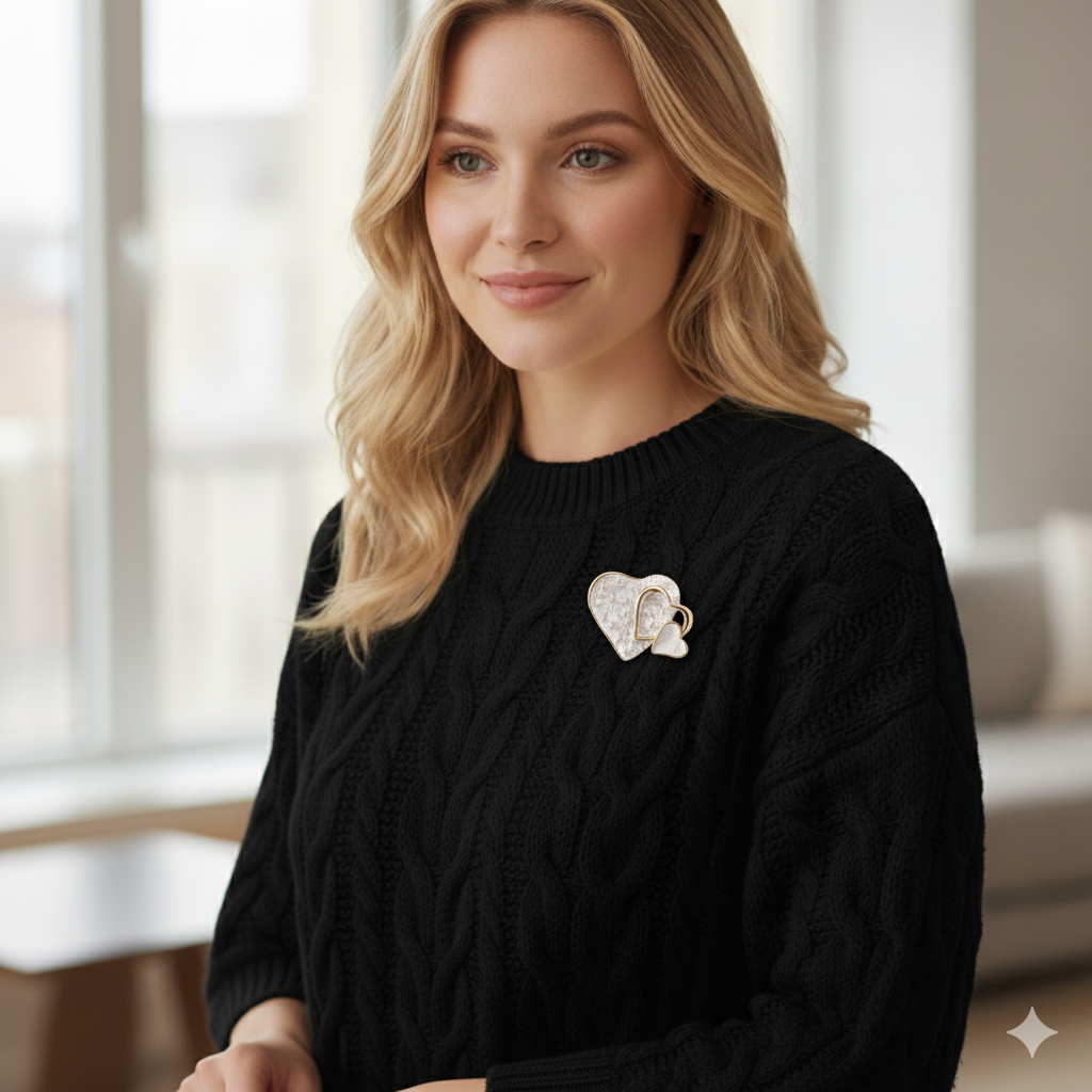 Die neutrale Farbgebung in Weiß mit gold-silbernen Akzenten macht diese Brosche zu einem universellen Accessoire. Sie harmoniert perfekt mit Business-Outfits, verleiht Abendgarderobe eine elegante Note und wertet Freizeitkleidung stilvoll auf. Besonders wirkungsvoll ist die Platzierung am Revers eines Blazers oder als Blickfang an einem einfarbigen Schal.